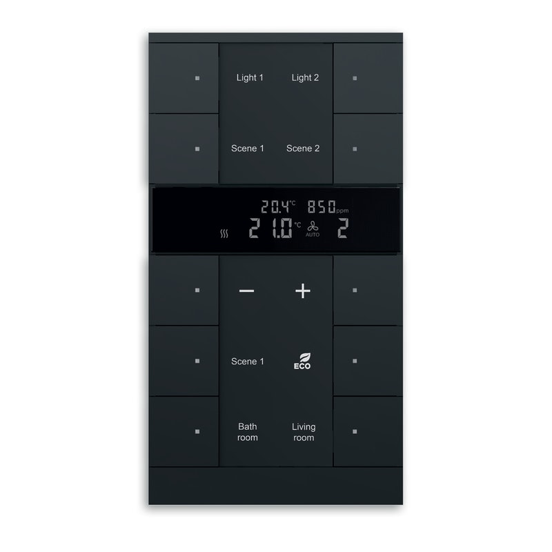 10-osainen painiketaulu termostaattitoiminnolla ja CO2- sekä ilmankosteusanturiella. Säätötavat ovat 2-piste ja PI-säätö (jatkuva ja epäjatkuva PI PWM-säätö). Laite on käyttäjäystävällinen ja mahdollistaa saumattoman käytön sekä paikallisesti että kosketusnäytöiltä 8136/09, 8136/12, 6136/07 tai visualisointiserveriltä 6136/APP-500 isäntä/orja-toiminnon kautta.