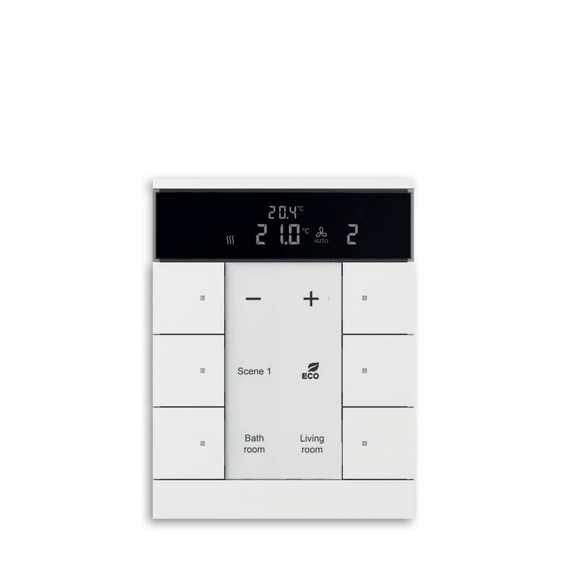 6-osainen painiketaulu orja-termostaattitoiminnolla, toimien isäntä-termostaatin paikalliskäyttöyksikkönä. Varsinainen termostaattitoiminto on toisessa laitteessa kuten: VCC/S, FCC/S tai premium läsänäolotunnistimessa.