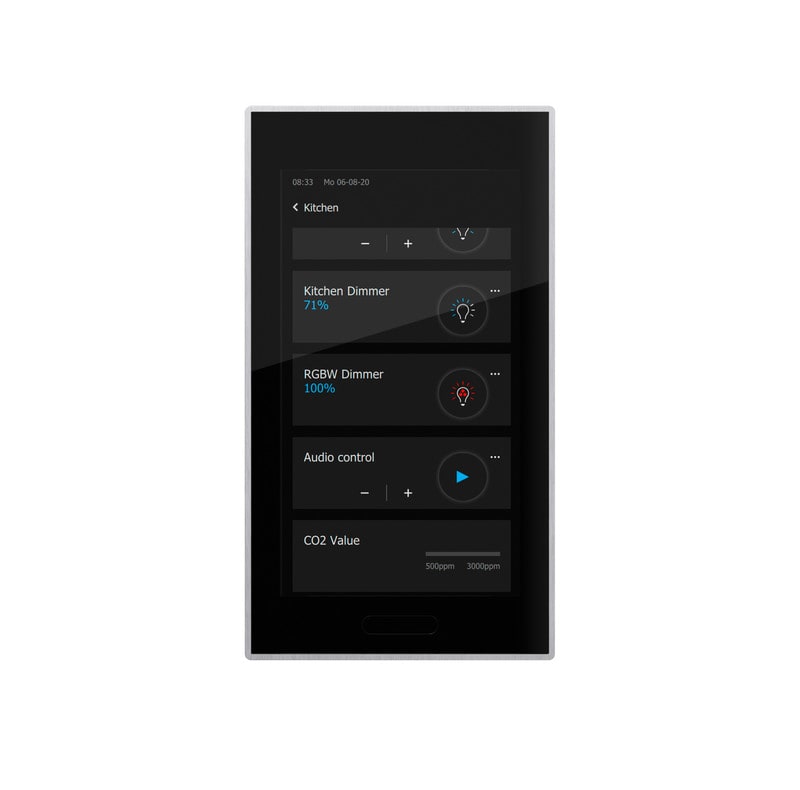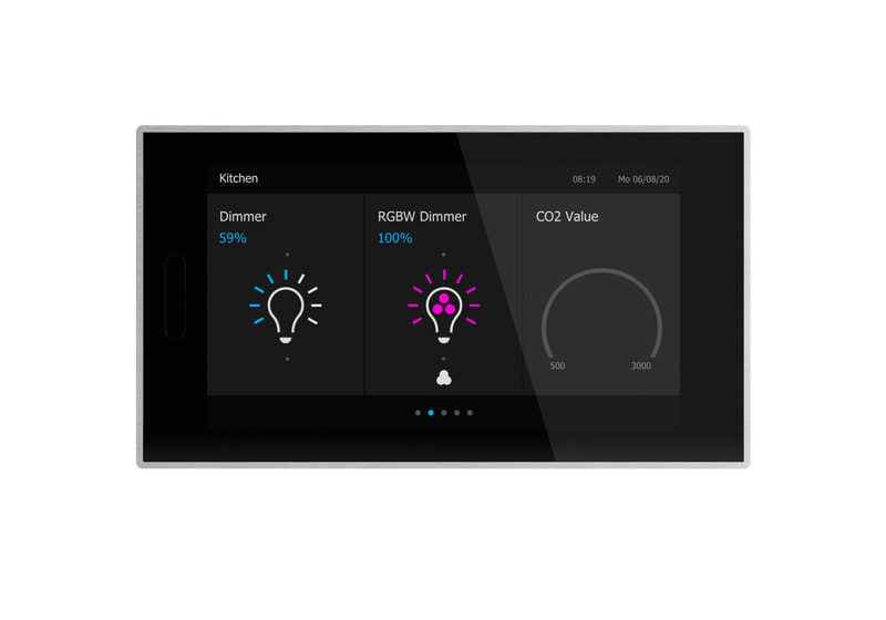 Monitoiminen HD IPS KNX -kosketusnäyttö huoneen KNX-järjestelmän toimintojen visualisointiin ja ohjaamiseen. Enintään 30 toimintoa/elementtejä jaettu 6 tai 10 sivulla (riippuen asennustavasta, vaaka/pysty). Seuraavien KNX-vakiotoimintojen näyttö ja ohjaus: Painike, kytkin, himmennys (4- ja 8-bittinen), liukusäädin, kaihdin, RGBW-ohjauselementti, huonelämpötilan säätöelementti, KNX-tilannekutsu, lämpöpumpun ohjauselementti, askelkytkin, äänentoistonohjauselementti. Lisätoiminnot: 20 vika- ja hälytystoimintoa, 10 logiikkatoimintoa, 10 ajastinta, joista jokaisella on 6 kytkentäaikaa, 4 KNX-tilannetoimintoa ja 1 termostaattitoiminto. Yksittäiset sivut voidaan suojata PIN-koodilla. Tilanäyttö, päivämäärän ja kellonajan sekä sisä- ja ulkolämpötilan näyttö. Integroitu lämpötila-anturi, läheisyysanturi ja valoisuusanturi. 1 kpl DI-tulo ja 1 kpl lämpötila-anturitulo (DP4-T-1/PT1000). Katselukulmanäyttö: 160 ° - 160 °. Asennus erillisen uppoasennettavan koteloon, BOX/U5.1. Ulkoinen apujännite: 20-32 VDC (SELV). Integroitu KNX-liityntä.