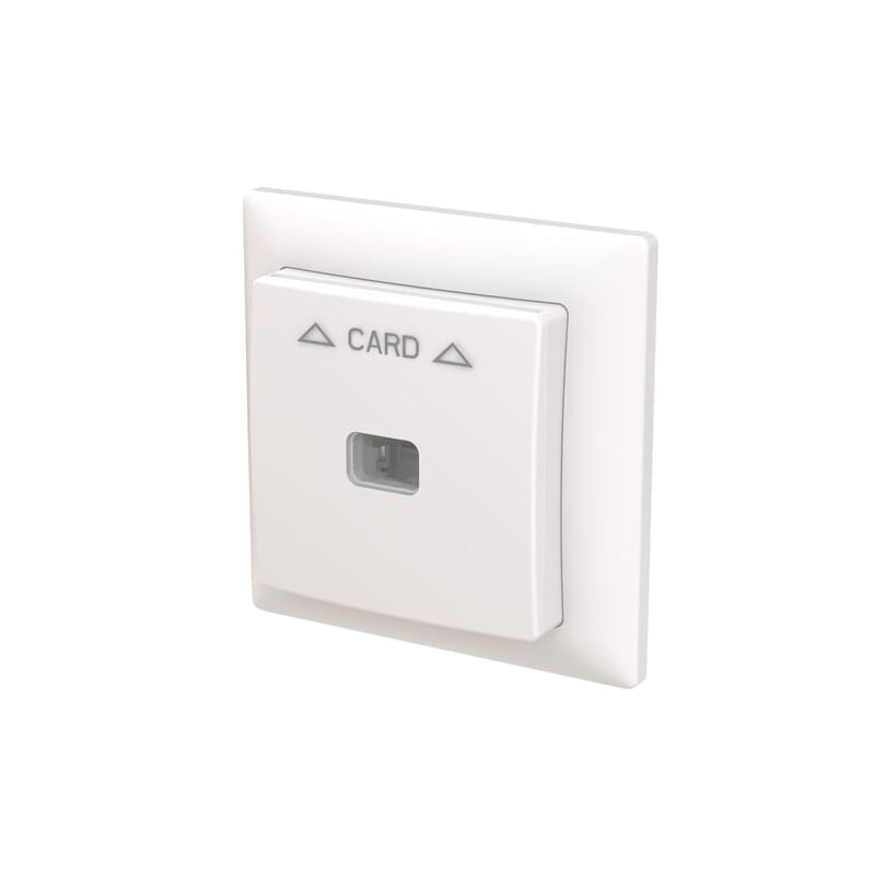 SAGA™ Hotellikorttikytkin jousiliittimin. Kytkintä voidaan käyttää esim. hotellihuoneen valaistuksen pääkytkimenä. Toimii noin luottokortin kokoisella huoneen avainkortilla. Sisältää hakuvalona toimivan LED-lampun (230). Muoviraaka-aineessa erittäin korkea UV-suojaus. Valkoinen RAL9003.