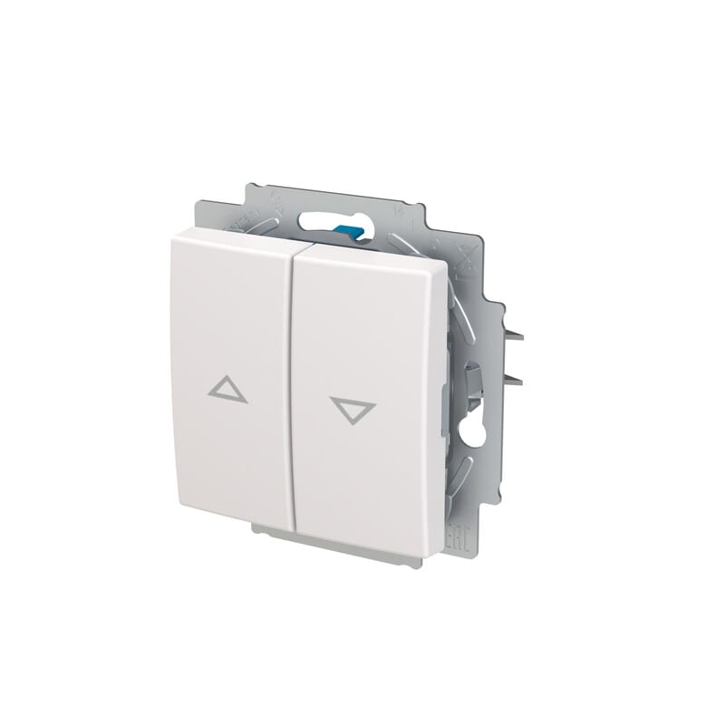 SAGA™ verhokytkin (ryhmä/vuoro-painikekytkin). Kytkin toimii siten että molempien painikkeiden samanaikainen painaminen on estetty, joten se sopii hyvin esim. verhomoottorin ohjaamiseen. Ei merkkivalomahdollisuutta. Muoviraaka-aineessa erittäin korkea UV-suojaus. Valkoinen RAL9003.