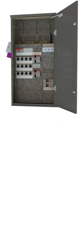 Maatilakeskus 620x1200x260mm, jossa on asennettuna tyyppi 1+2:n ylijännitesuojat