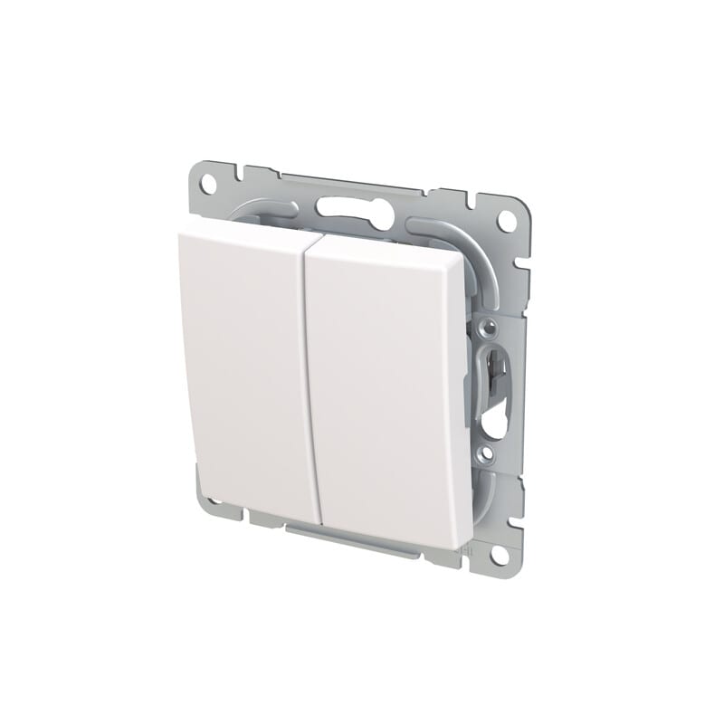 SAGA™ tuote on valmistettu Suomessa. 2-vipuinen painike jousikiinnitteisellä vivulla ja jousiliittimin. Liittimiin voi kytkeä max 2 johdinta ja ne on hyväksytty ML ja MK johtimille. Valkoinen RAL9003.