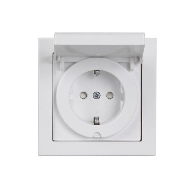 Pistorasia, Impressivo, 1-os, maad, IP44, kokonainen tuote, valkoinen,jousiliittimin, ei lisäliittimiä Uppoasennettava roiskevesitiivis pistorasia. Pistorasiassa on liittimet kahdelle johdolle kutakin kosketinta kohden. Ei lisäliittimiä. Liittimet on hyväksytty ML ja MK johtimille. Läppäkansi on varustettu jousimekanismilla.