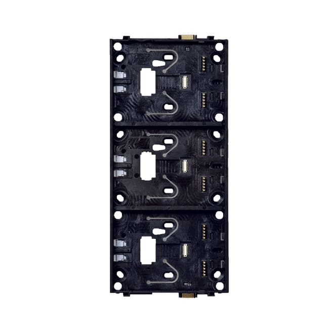 3-osainen aluslevy Busch-priOn® elementeille (painikkeet, päätykappaleet jne.). Elementit kiinnitetään aluslevyyn painamalla paikalleen. 6346/12-101-500 aluslevyn kanssa käytetään 6120/13-500 väyläliitäntäyksikköä.