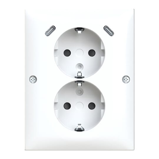 Pistorasia, SAGA, 2-osainen, 2 x USB C laturilla, kulma-asennus, valkoinen SAGA® 2-osainen kulmapistorasia kahdella sisäänrakennetulla USB C-latausportilla varustettuna.