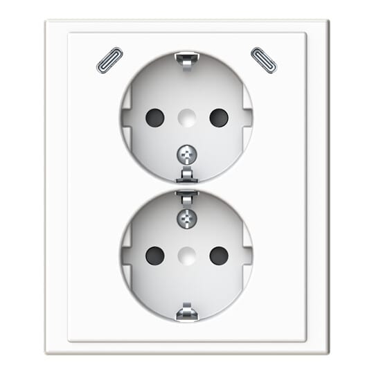 Pistorasia, Impressivo, 2-osainen, maadoitettu, 2 x USB C laturilla, valkoinen Impressivo® kokopeitelevyllinen kaksoispistorasia kahdella sisäänrakennetulla USB C-latausportilla varustettuna.