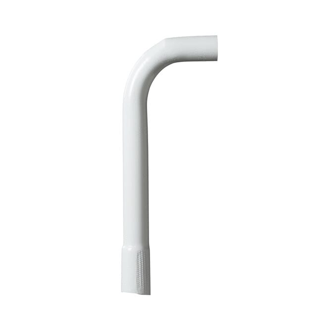 Esitaivutettu halogeenivapaa muoviputken kaari. Halkaisija 25 mm. 90° kulma. Muhvi putken pitkässä päässä. Puristuslujuus 750N.