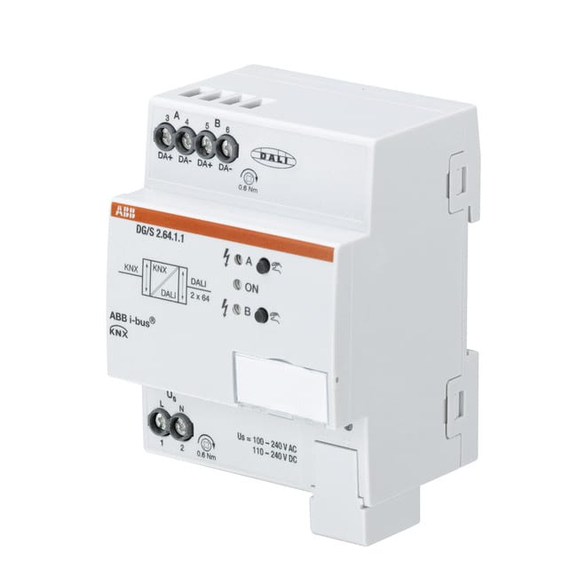 Digitaalinen valaistuksen ohjain enintään 2 x 64 kpl DALI-liitäntälaitteille. Ohjaus yksilöllisesti (2x64), ryhmässä (2x16), ylesiohjauksella (kaikki) tai tilanneohjauksella (2x16). Laajat vikatiedot ja monipuoliset hälytystoiminnot määritettävissä. Muunnin täyttää turvavalojen valvonnan ja ohjauksen DALI-standardin EN 62386-202. Muuntimella voidaan testata ja valvoa turva- ja poistumistivalaisimia akkuineen. Laitteessa lisäksi porrasvaloautomaatti-, pakko-ohjaus- ja estotoiminto. Ohjelmointi tehdään ETS:ssä sekä DALI-ohjelmointi erillisellä ABB i-bus® Tool ohjelmistolla. Leveys 4 moduulia.