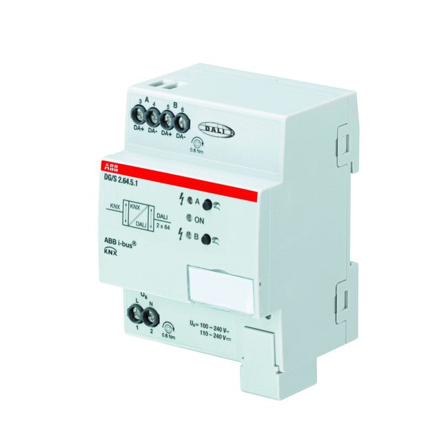 DALI2-standardin mukainen KNX/DALI-ohjain enintään 2 x 64 kpl DALI-liitäntälaitteille. Värilämpötilan säätö mahdollista DALI type 8 liitäntälaitteita. Ohjaus yksilöllisesti (2x64 kpl), ryhmässä (2x16 kpl), yleisohjauksella (kaikki) tai tilanneohjauksella (2x16 kpl). Laajat vikatiedot ja monipuoliset hälytystoiminnot määritettävissä. Ohjain täyttää turvavalojen valvonnan ja ohjauksen DALI-standardin EN 62386-202 mukaisesti. Ohjaimella voidaan testata ja valvoa turva- ja poistumistivalaisimia akkuineen. Laitteessa lisäksi porrasvaloautomaatti-, pakko-ohjaus- ja estotoiminto. Ohjelmointi tehdään ETS:ssä sekä DALI-ohjelmointi erillisellä ABB i-bus® Tool ohjelmistolla.