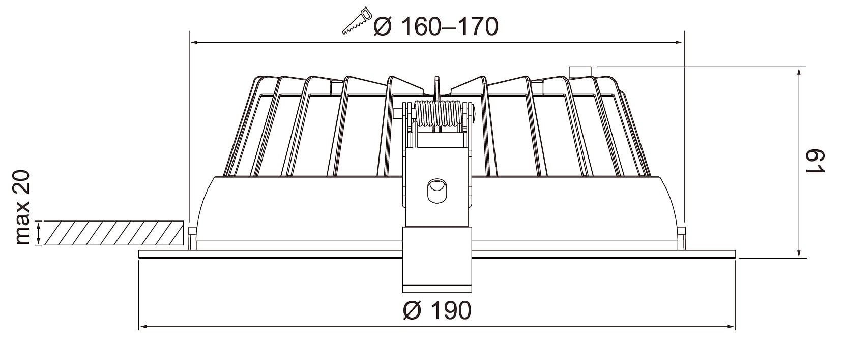 - 170 mm: 18 W 2700 lm, 20 W 3000 lm, 22 W 3300 lm, 24 W 3350 lm.