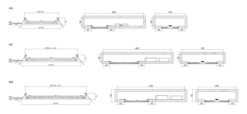 - Kiinteä led 8 W / 500 lm, 12 W / 1000 lm, 18 W / 1500 lm.