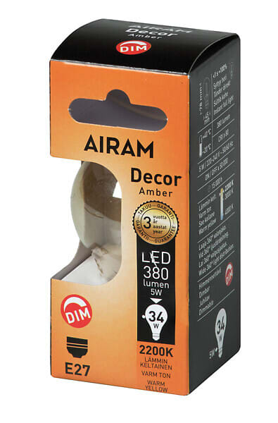 Himmennettävät Amber-sarjan lamput ovat kuin tunnelmallisia hiililankalamppuja, nyt vain moderneina led-versioina. Himmennettävyydestä kertoo hyvin erottuva DIM-symboli. Käytä vain led-himmennintä. Valo on lämmintä ja pehmeää ja valonjako erinomainen 360 astetta. Kuvun värisävynä on lämmin meripihka. Tyylikkääseen valaisinjohtoon yhdistettyinä lamput ovat näyttäviä sellaisenaan, ilman varjostinta. Ympäristöystävälliset pahvipakkaukset on värikoodattu. Väri kertoo hehkulamppuvastaavuuden ja helpottaa kuluttajan valintaa. Myös tekniset tiedot on esitetty selkeästi.