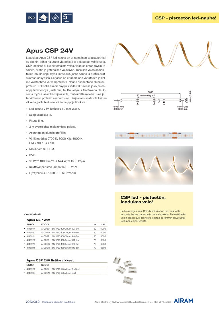 Laadukas Apus CSP led-nauha on erinomainen valaistusratkaisu tiloihin, joihin halutaan yhtenäistä ja epäsuoraa valaistusta. CSP-ledeissä ei ole pistemäistä valoa, vaan se antaa täysin tasaisen, siistin ja yhtenäisen valoviivan. Tasaisen valon ansiosta led-nauha sopii myös kohteisiin, jossa nauha ja profiili ovat suoraan näkyvissä. Sarjassa on erinomainen värintoisto ja kolme vaihtoehtoa värilämpötilasta. Nauha asennetaan alumiiniprofiiliin. Erillisellä himmennysyksiköllä valittavissa joko painonappihimmennys (Push dim) tai Dali-ohjaus. Saatavana tilauksesta myös Casambi-ohjauksella, määrämittaan leikattuna ja tarvittaessa profiiliin asennettuna. Sarjaan on saatavilla lisätarvikkeita, joilla teet nauhoihin helppoja liitoksia.