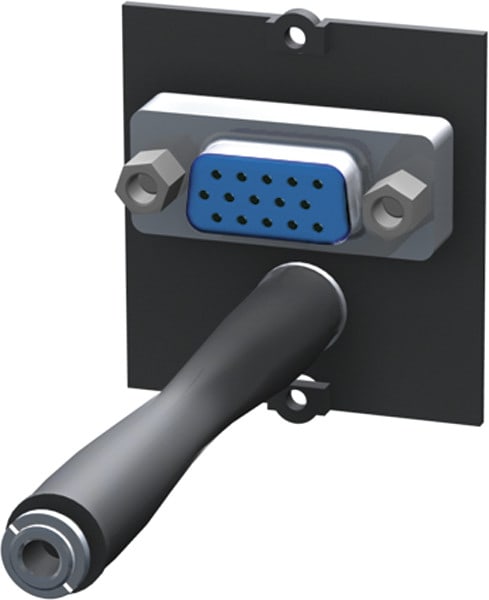 Etupuoli VGA-naarasliitin ja minijakki 3.5mm stereo. Taustapuoli VGA-naarasliitin ja minijakki 3.5mm stereo. 3.5mm minijakilla 10cm johto. Moduulin tarvittava asennussyvyys 70mm. Väri musta.