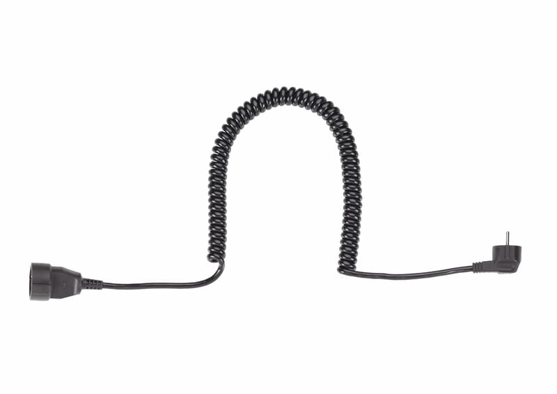 Venymäkerroin 1:4. 70 C. 1-osainen pistorasia toisessa päässä spiraalia ja toisessa päässä kulmapistotulppa. Materiaali PVC. Väri musta. Spiraalikaapelin pituus kerällä 500mm ja venytettynä 2000mm.