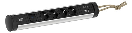 Tässä mallissa on 4 schukopistorasiaa, sekä kytkin ja USB A&C-latausmoduuli, jossa on yksi A-latausliitin sekä yksi C-latausliitin. Paneelissa on kiinteä 2,5m virtajohto kulmapistokkeella.