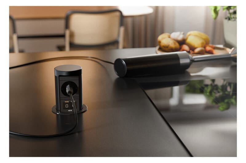 Tilaa säästävä pop-up mallinen, upotettava ratkaisu sopii vakiokokoiseen 80 mm aukkoon ja vaatii 180 mm asennussyvyyden. Soveltuu myös jälkikäteen asennettuna muun muassa työtasoihin, kaappeihin ja keittiösaarekkeisiin.