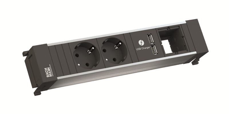 Power Frame pistorasiapaneeli medium. 2 x pistorasia + USB-lataus 2:llaA-liittimellä + 1 x tyhjä custom moduulipaikka. Paneelissa WielandGST18i3-liitäntäjohto 0,2m. Power Frame-pistorasiapaneeli 2:lla pistorasialla ja USB-latausmoduulilla, jossa kaksi USB-A liitäntää/ulostuloa sekä lisäksi 1:llä tyhjällä custom moduulipaikalla.