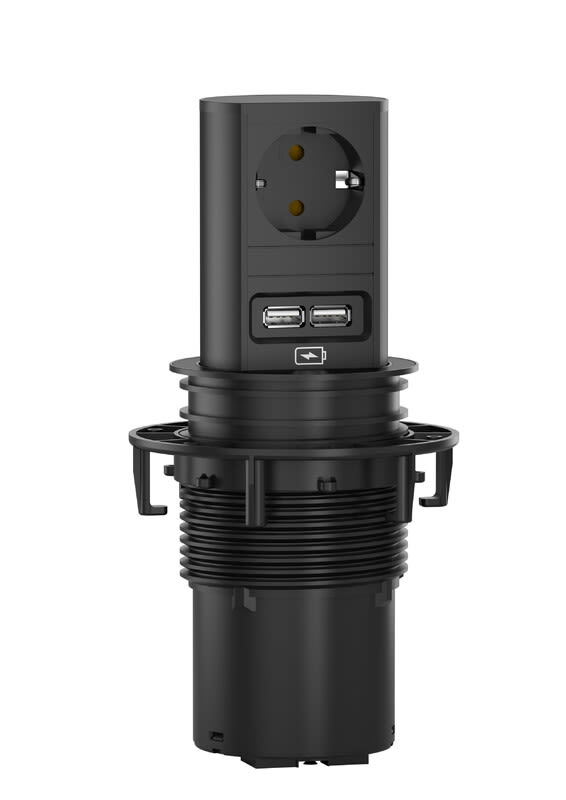 ELEVATOR pop-up pistorasiapaneeli 1x schukopistorasia + 2 x USB latausA-liittimin. 3.1A/5V yhteisulostuloteho. Mattamusta RAL9005. Elevator pistorasiapaneeli, mattamusta. 1 x pistorasia ja USB-lataus tuplaliittimin, 2 x A.