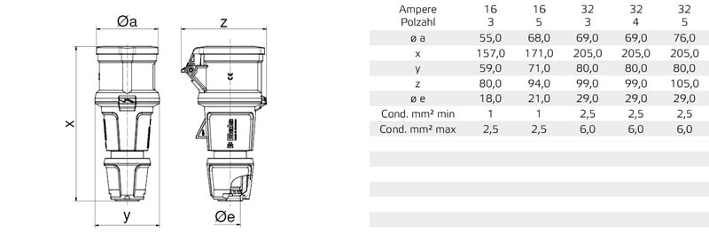 - luotettava vedonpoistoholkki, suojaluokka IP67, suuremmat kaapelipoikkipinnat, kaapelin läpiviennin vetolujuus ylittää monikertaisesti standardivaatimukset IEC 60309, EN60309 ja VDE0623