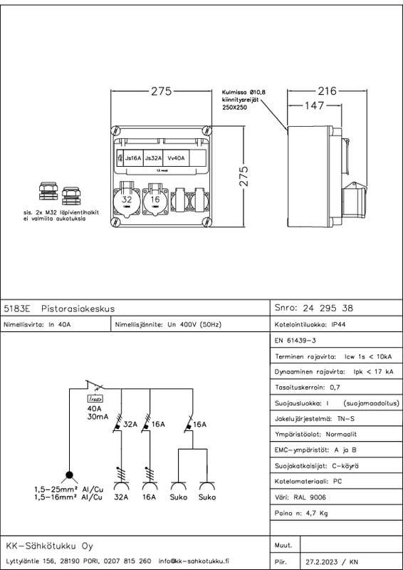 Mukana 2 kpl M32 läpivientiholkit, kaapeli max Ø21mm