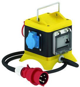 Siirrettävä Uni-Block kumikeskus kantokahvalla. Varustus 2kpl sukop.rasia 16A/230V