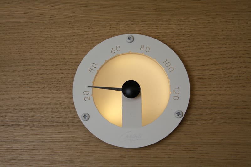 Saunan lämpömittari on valmistettu satiinimassalasista sekä hiotusta valkoiseksi maalatusta rst-asteikosta. Mittari valaistuu yhdellä 2-4 mm kuidulla. Lämpömittari asennetaan paneloinnin yhteydessä. Mittarin halkaisija on 120 mm ja upotussyvyys 40 mm. Ulkonema seinäpinnasta 20 mm. Kiinnittyy seinäpaneliin kolmella mukana tulevalla rst-ruuvilla.