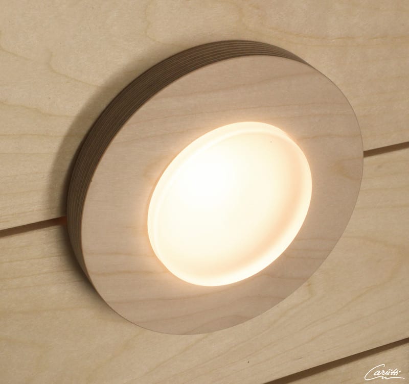 Pyöreä yleisvalaisin, joka sopii erinomaisesti saunan ja pesuhuoneen valaistukseen. Valaisinta voidaan käyttää katossa tai esim. lauteiden alla. Materiaalina matta massalasi, alumiiniheijastin sekä puukehys. Kehyksen voi haluttaessa käsitellä puunsuojaöljyllä, jos halutaan tummempaa sävyä.