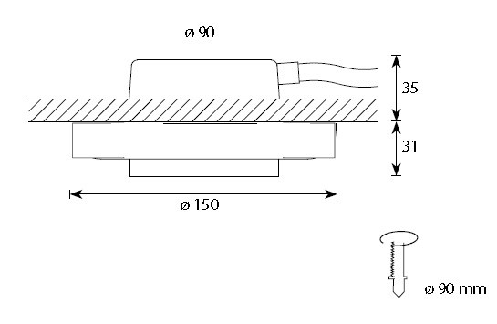 Kalusteen mitat ovat seuraavat: ulkohalkaisija 150 mm, asennusreiän halkaisija 90 mm, upotussyvyys 35 mm ja ulkonema kattopinnasta 31 mm.
