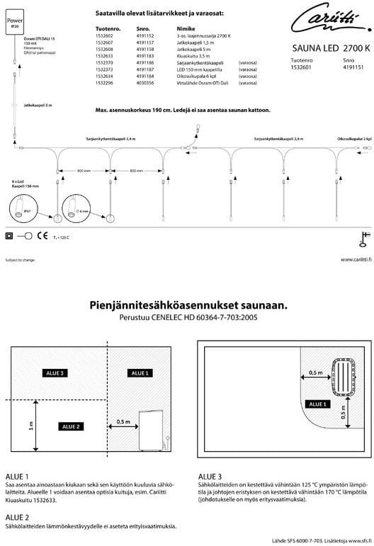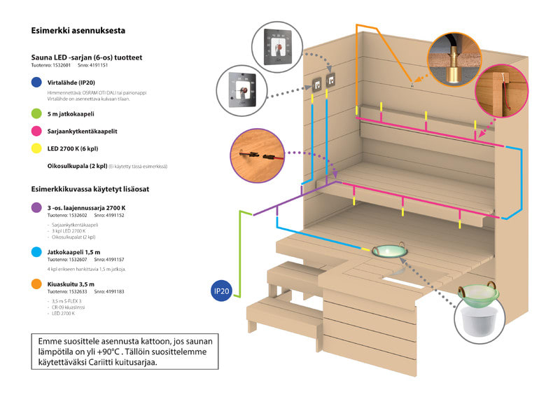Jos saunan lämpötila on yli +80ºC tai saunassa käytetään puulämmitteistä kiuasta, suosittelemme käyttämään Cariitti-valokuitusarjaa.