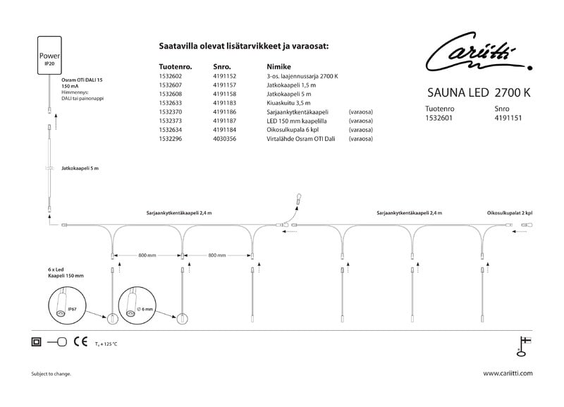 Saunaan ja lauteisiin helposti asennettava LED-sarja. Sarjassa olevat ledit tarvitsevat esim. laudeasennuksessa ainoastaan 6 mm:n reiän, jolloin asennus onnistuu paljon huomaamattomammin, kuin mitä aiemmin on totuttu. Selkeät asennusohjeet takaavat, että asennuksessa ei voi epäonnistua; liittimet on valittu niin ettei niitä voi kytkeä väärin. Virtalähteenä laadukas Osram OTi DALI 15, jolloin sarjaa voi himmentää joko painonapilla tai dali-säätimellä. Sarjaa voi laajentaa erillisellä 3-os. laajennusosalla aina 15 lediin saakka. Värilämpötila saunaan sopiva 2700 K LED IP67. Sarjaan on saatavilla useita lisätarvikkeita, kuten CR-03-asennuskalusteet (kulta, kromi ja musta), kiuaskuitu linssillä, lämpö- ja kosteusmittarit ja paljon muuta.