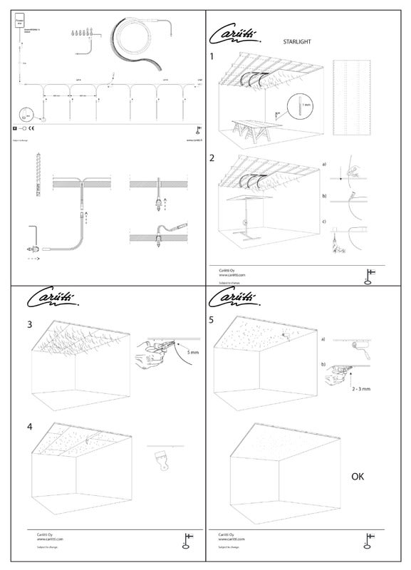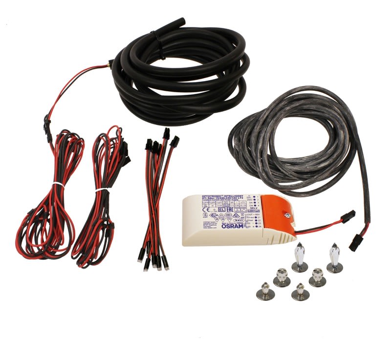 Täydellinen asennusvalmis sarja sisältää muovikuitunipun (75 kuitua), 6 kpl kristalleja (2 x CR-12, 2 x CR-16 ja 2 x CR-31), 6 kpl 1W:n ledejä (4000K/IP67) sekä virtalähteen.
