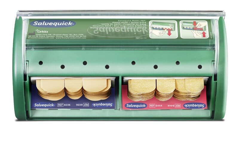Salvequick laastariautomaatti eri laastarivaihtoehtoineen onhelppokäyttöinen ratkaisu työpaikalle. Salvequick laastariautomaatti eri laastarivaihtoehtoineen on helppokäyttöinen ratkaisu työpaikalle. Heti käyttövalmiiden laastareiden vetäminen laastariautomaatista onnistuu yhdelläkin kädellä hygieenisesti ilman suojapaperin availua ja saksien kanssa temppuilua. Alaspäin vedettäessä estetään muiden laastareiden likaantuminen ja kastuminen. Läpinäkyvä kansi suojaa laastareita lialta ja pölyltä. Laastarikasetit ovat lukittuna automaatissa, mikä estää hävikkiä. Automaattiin voi täydentää useita eri laastarivaihtoehtoja. Ensiapuaseman vihreät osat valmistetaan >85%:sti kierrätetystä muovista. Sisältö: 40 kangaslaastaria (REF 6444) 45 muovilaastaria (REF 6036) Mitat: L 23 x K 12 x S 5,5 cm