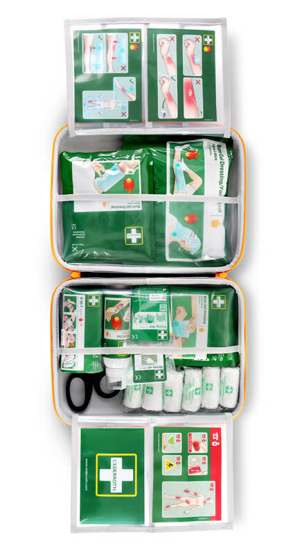Mukaan otettava laukku palovammojen ensiapuun. Jäähdyttävät ja kipualievittävät palovammatuotteet ensimmäisen ja toisen asteen palovammojenensiapuun. Mukaan otettava laukku palovammojen ensiapuun. Jäähdyttävät ja kipua lievittävät palovammatuotteet ensimmäisen ja toisen asteen palovammoille. Laukku sisältää kolmea eri kokoista palovammataitosta, 10x10 cm, 20x20 cm sekä 30x40 cm taitoksen/kasvomaskin, joita on helppo käyttää pakkauksen kuvallisten ohjeiden avulla. Kantokahvallisen laukun käyttötarkoituksen erottaa muista ensiapulaukuista liekkikuva ja oranssi vetoketju. Tuotteet on sijoitettu laukun läpinäkyviin muovitaskuihin, mikä helpottaa ja nopeuttaa oikean tuotteen löytämistä. Tarkoitettu erityisesti työpaikoille, joissa palovammojen riski on suuri, eli mm. rakennus-, paperi-, metalli, kemian ja elintarviketeollisuuden työpaikoille sekä HoReCa alalle. Kohonneen palovammariskin tyypillisesti aiheuttaa mm. avotuli, kuumat pinnat, uunit, kuumat höyryt ja nesteet. Sisältö: 1 Burn Gel palovammataitos/kasvomaski 30x40 cm (REF 51011014) 2 Burn Gel palovammataitos 20x20 cm (REF 51011015) 4 Burn Gel palovammataitos 10x10 cm (REF 901900) 1 Burn Gel palovammageeli, 100 ml (REF 51011005) 1 Cederroth 4-in-1 iso ensiapuside (REF 1910) 1 verkkoside 6 harsosidosrullaa taitosten kiinnittämiseen 6 cm x 8 m 2 paria suojakäsineitä 1 sakset (REF 270002) 1 Palovammataitosten käyttöohje 1 Ensiapuohje 1 Sisällysluettelo Mitat: L 31 x K 25 x S 8cm