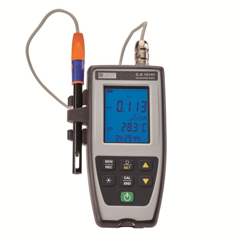 Johtavuusmittari loggeritoiminnolla. CA10141 johtavuusmittaria käytetään juoma- ja jätevedenlaadun tarkasteluun. Ergonominen muotoilu ja isokokoinen, tastavalaistu näyttö tekevät mittaustulosten tarkastelusta helppoa sekä laboratorio- että kenttäolosuhteissa.