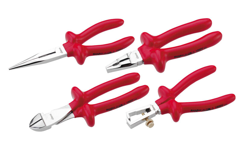 Turvapihtien lajitelma, kahvat kaksinkertaisella dip-pinnoitteella,puhelinpihdit suorat 200 mm, yhdistelmäpihdit 185 mm, sivuleikkuri 160mm ja kuorintapihdit 160 mm.