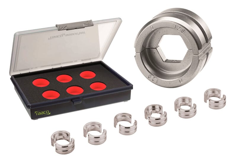 Puristemuottisarja 6-osainen, alumiinisille kaapelikannattimille, 70 mm²- 240 mm². Toimitetaan korkealaatuisessa säilytyslaatikossa.