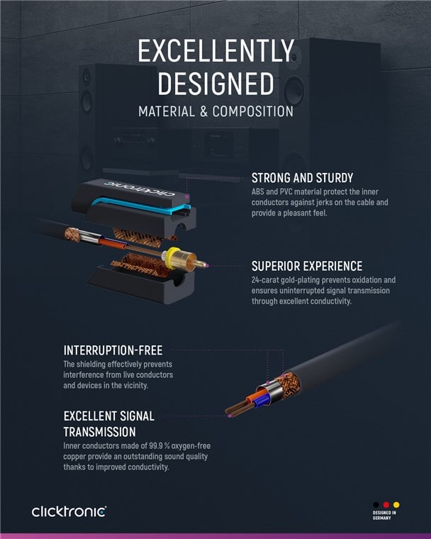 Premium-kaapeli. 1 x 3,5 mm:n liitin <> 2 x cinch-pistoke. 7,5 metriä. OFC-sisäjohdin Cinch-kaapeli lähettää stereoäänisignaaleja parhaalla äänenlaadulla ensiluokkaisen äänen takaamiseksi. RCA-jakkikaapeli on ihanteellinen ratkaisu 3,5 mm:n jakkiliitännällä varustettujen laitteiden, kuten älypuhelimien tai tablettien, liittämiseen hifijärjestelmiin tai kaiuttimiin, joissa on RCA-tulo. 24 karaatin kullatut, ruostumattomat RCA-liittimet minimaaliseen lähetysvastukseen ja kristallinkirkkaaseen ääneen 99,9 % hapettomasta kuparijohtimesta valmistettu kaapeli takaa optimaalisen siirtonopeuden. Joustava ja kestävä PVC-kaapelivaippa mahdollistaa liitäntäkaapelin helpon taivuttamisen ja reitityksen. Clicktronic-äänikaapeli 2-kertaisella alumiinifoliosuojauksella ja kuparipunoksella loistavan signaalinlaadun takaamiseksi