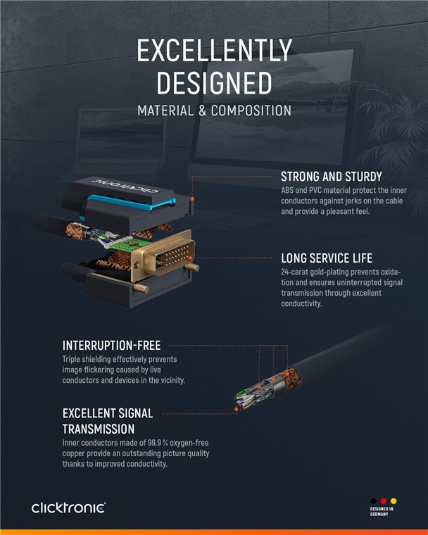 Premium-kaapeli. 1x DVI-D-liitin Dual-Link (24+1) <> 1x HDMI-liitin™. 7,5 metriä. WQXGA @ 60 Hz DVI-D-HDMI-kaapeli™ on ihanteellinen näyttöjen liittämiseen viihdemediaan, kuten pelitietokoneeseen, pelikonsoliin tai Blu-Ray-soittimeen. Lähettää digitaalisia ääni- ja videosignaaleja molempiin suuntiin, esim. pelitietokoneesta näyttöön UHD-signaalin siirto WQXGA @ 60 Hz (1600p) ja Full HD @ 60 Hz (1080p) HDMI-liitäntäkaapeli™, jonka suurin siirtonopeus on jopa 4,95 Gbit/s 24 karaatin kullatut HDMI-liittimet™ ja edistyksellinen tekniikka takaavat virheettömän signaalinlaadun ilman kuvansiirtoviiveitä optimaalisen viihdekokemuksen takaamiseksi. 2-kertainen suojaus ja sisäjohdin 99,9 % hapettomasta kuparista takaavat kristallinkirkkaan äänen ja neulanterävän video- ja kuvanlaadun Joustava taivutussuoja ja vankka PVC-kaapelivaippa mahdollistavat liitäntäkaapelin taivuttamisen vahingoittumatta.