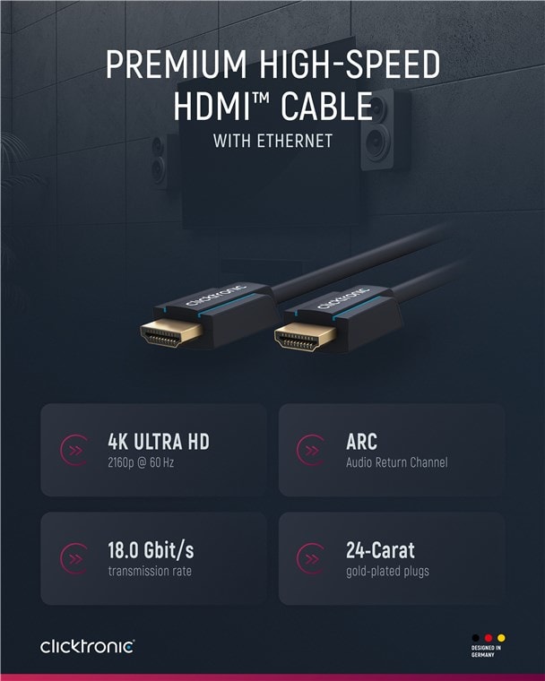 Premium-kaapeli. 1x HDMI-liitin™ <> 1x HDMI-liitin™. 1,5 m. UHD 4K @ 60 Hz Clicktronic 4K -kaapeli virallisella HDMI™ Premium -sertifioinnilla takaa parhaan laadun. UHD-signaalin siirto jopa 4K @ 60 Hz (2160p) ja Full HD @ 60 Hz (1080p) HDMI-liitäntäkaapeli™, jonka suurin siirtonopeus on jopa 18 Gbit/s 24 karaatin kullatut HDMI-liittimet™ ja edistyksellinen tekniikka takaavat virheettömän signaalinlaadun ilman kuvansiirtoviiveitä optimaalisen pelikokemuksen takaamiseksi. Puhtaat kuparijohtimet ja 2-kertainen suojaus takaavat selkeän äänen ja veitsenterävän video- ja kuvanlaadun Ensiluokkainen HDMI-nopea™ kaapeli yhdistää televisiot ja näytöt esimerkiksi kannettaviin tietokoneisiin, projektoreihin, projektoreihin tai pelikonsoleihin, kuten PlayStationiin tai Xboxiin, virheettömän elokuva- ja pelikokemuksen takaamiseksi. HDMI-liitäntä™ kaikille yleisille ominaisuuksille, kuten ARC (äänen paluukanava), HDCP- tai 3D-sisällölle