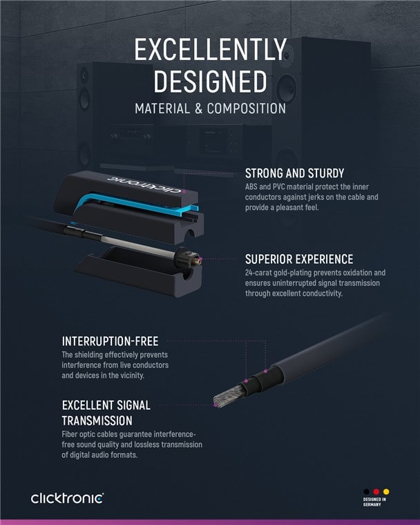 Premium-kaapeli. 1x Toslink-pistoke <> 1x Toslink-pistoke. 0,5 m. Polymeerikuituoptinen kaapeli Yhdistettynä nykyaikaisiin äänikomponentteihin, kuten kotiteatterijärjestelmiin, optinen kaapeli luo vertaansa vailla olevan äänikokemuksen. Digitaalinen kaapeli TOSLINK-liitännällä varustettujen laitteiden, kuten pelikonsolien, hifi-järjestelmien, kotiteatterijärjestelmien, Blu-Ray-soittimien, äänenvahvistimien, tietokoneiden tai televisioiden, helppoon kaapelointiin Polymeerioptinen kuitu erittäin suurella valoteholla takaa erinomaisen äänensiirron täydellisellä, digitaalisella äänenlaadulla Digitaalisten ja optisten signaalien siirron vuoksi valokuitukaapeli ei ole herkkä sähkömagneettisille häiriölähteille. Optinen äänikaapeli, jossa on tarkasti sovitetut PVC/ABS-liittimet ja 3,5 mm:n sovitinpistoke täydelliseen liitäntään Vankka, erittäin joustava PVC-kaapelivaippa takaa kestävyyden. Asennetut polymeerioptiset kuidut ovat vielä laadukkaampia ja kestävämpiä kuin valokuitukaapelit ja takaavat loistavan signaalin laadun.