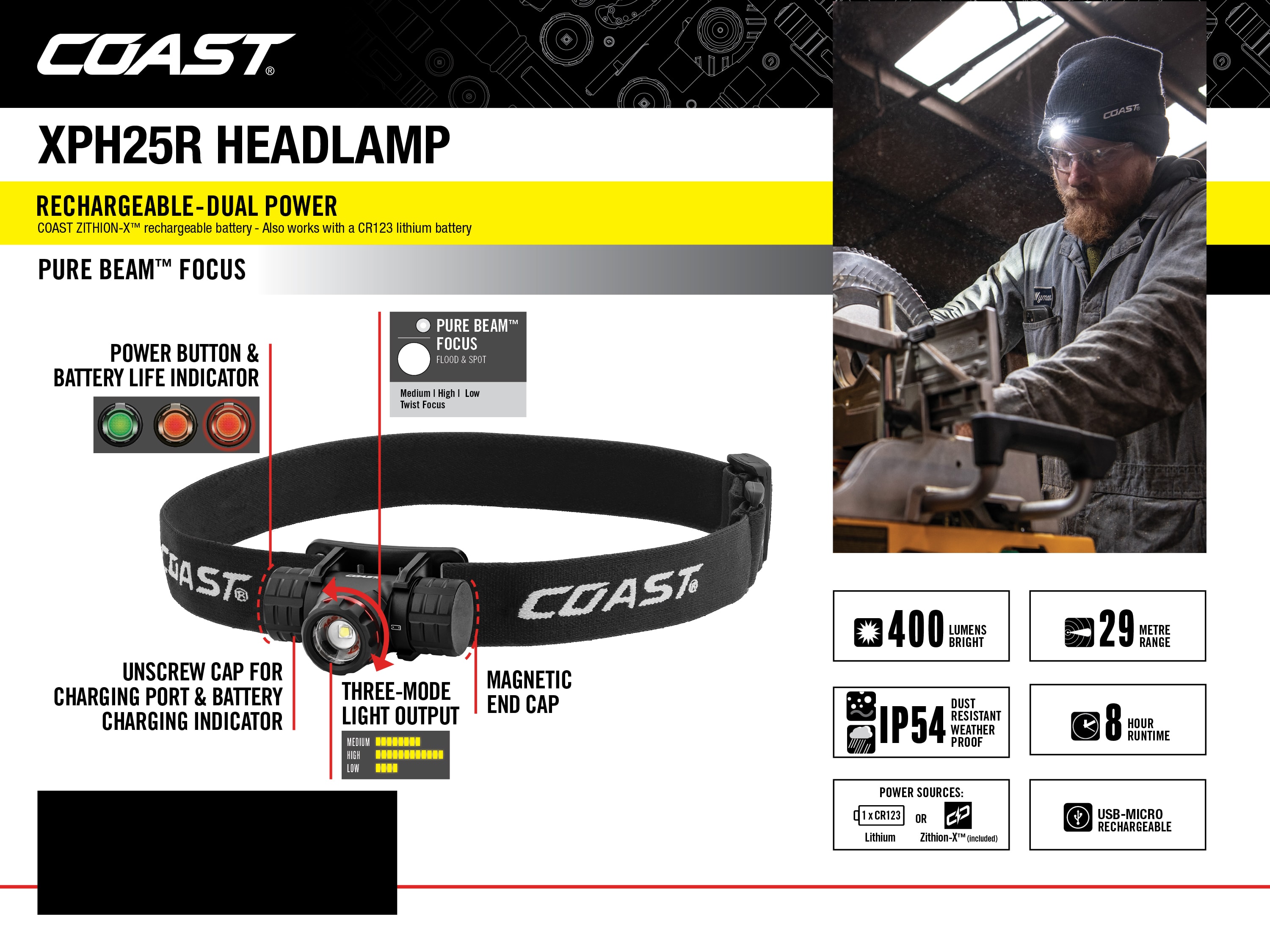 COAST XPH25R LED on Micro USB-ladattava monitoimi otsa-ja käsivalaisin. Valaisimessa on patentointu Pure Beam Focusing Optic – valaisu-ja linssioptiikka. Kiertämällä valaisinta voit kohdistaa leveän (flood) valokeilan tarvittaessa (Spot) tarkennukseen. Valaisimessa on kolme valotilatehoa: keski, kirkas, matala. Voit irroittaa täysvarustellun valaisimen helposti otsapannasta ja käyttää sitä käsivalaisimena. Valaisimen alumiinirunko on pölytiivis ja säänkestävä IP54-luokituksella. Valaisimen peräosassa on magneetti, jonka avulla valaisin voidaan asettaa kiinni metallipintoihin. Valaisimen virtalähteenä toimii mukana toimitettava erittäin suorituskykyinen COAST ZITHION X™ ladattava akku ja valaisin toimii myös 1 x CR 123 Lithium paristoilla (hankittava erikseen). Voit ladata ZITHION X™ akun irrallisena tai valaisimessa kiinni ollessaan latausportin kautta.