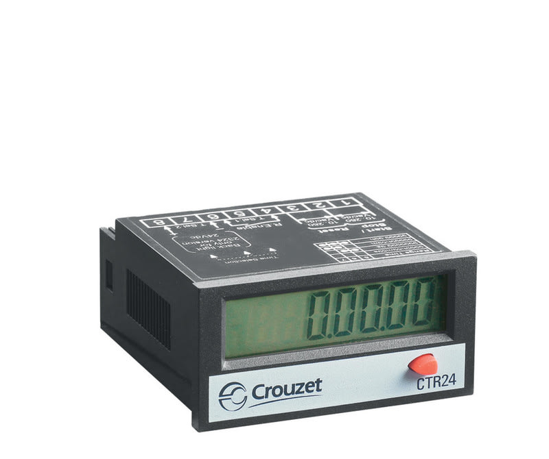 Crouzetin CTR24-sarjan käyttöaikalaskurit ovat paristokäyttöisiä ja paneeliasenteisia. Etulevyn koko on 24x48mm. Valittavissa 4 eri aika-aluetta: 99999 h 59 min, 99999 h 99h, 9999 h 59 min 59 s ja 9999999,9 s. Tulona 4 - 30 V DC (NPN), kontakti tai Open collector. Valittavissa resetointi etulevystä tai kytkennällisesti esimerkiksi erillisestä painikkeesta. Asennusaukko 22,2 x 45 mm.