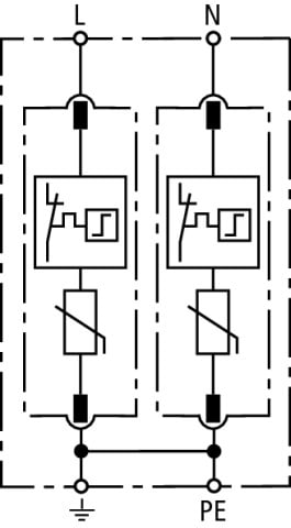 Kaksinapainen tehokkailla sinkkioksidivaristoreilla toteutettu ylijännitesuoja T2 (keskisuoja). Toimintakunnon valvonta kaksitoimisella "Thermo Dynamic Control" menetelmällä, vikatilanteessa automaattinen poiskytkentä.
