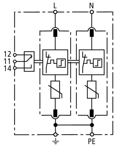 Kaksinapainen tehokkailla sinkkioksidivaristoreilla toteutettu ylijännitesuoja T2 (keskisuoja). Toimintakunnon valvonta kaksitoimisella "Thermo Dynamic Control" menetelmällä, vikatilanteessa automaattinen poiskytkentä. Purkausvirran (8/20 μs) kestoisuus 40 kA / napa. Varustettu hälytyskoskettimella (FM). Asennus tyypillisesti ryhmäkeskukseen. VDE, KEMA, UL ja VdS sertifioitu. Tarkemmat tiedot englanninkielisessä "Tekniset tiedot" datalehdessä.