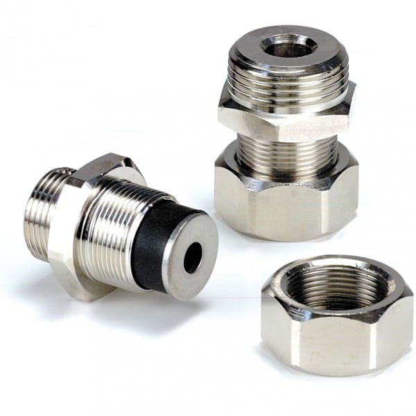 Paineläpivienti, jossa ¾” sekä 1” kierteet. Paineläpivienti koostuu neljästä osasta: runko-osa (kierre ¾” & 1”), kumitiiviste, aluslevy ja mutteri.