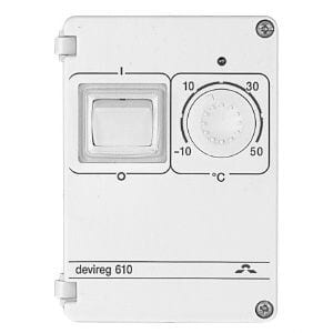 DEVIreg™ 610 termostaattia käytetään mm. saattolämmityksissä, ulkoalueiden sekä putkien sulanapidossa. Lämpötilan säätöalue on –10 °...+50 °C välillä. Termostaatti asennetaan joko seinään tai putken kylkeen. Se kestää ulkona normaalit sääolosuhteet, kotelointiluokka on IP 44.