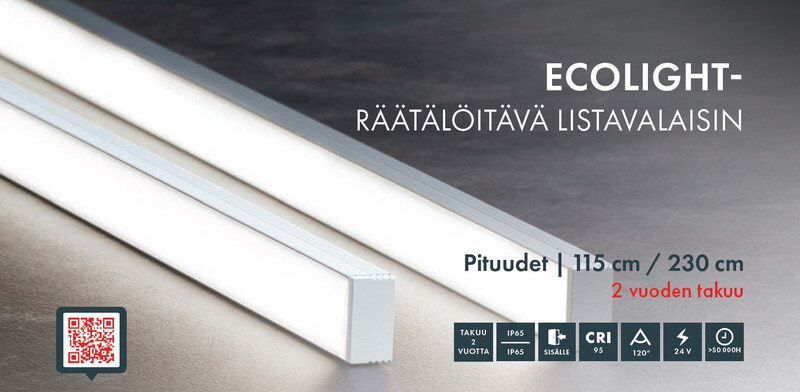 Valaisin on täysin valmis käyttöön otettavaksi. Lisää pakettiin liitäntälaite ja valonohjaus ja tee paketistasi himmennettävä! Valaisin sopii kaikkiin kalustuksiin ja on IP65 kosteussuojattu, joten voit asentaa sen valuvan veden alle ja kosteisiin paikkoihin. Dreamled Ecoligh-setti on erittäin helppo hankkia: 1. Valitse haluamasi runkoväri, valonväri ja pituus 2. Lisää pakettiin 24V-muuntaja yhteensopivista tuotteista 3. Lisää halutessasi langaton valonohjaus (vastaanotin ja säädin tai setti) 4. Tilaa ja valitse toimitustapa 5. Asenna, pikalittimillä asentaminen on superhelppoa kenelle tahansta! Valaisinrunko on katkaistavissa kahteen osaan ja koska led-nauhassa on molemmissa päissä syöttökaapeli, saat yhdestä paketista kaksi valaisinta, esim. lieden molemmille puolille tai keittiön kulmaan. Huolimatta valaisimen ultramatalasta rakenteesta, Ecolight on täysin pisteetön. Pisteettömyydestä pitää huolen parasta mahdollista laatua oleva huurrettu linssi, joka on Saksassa valmistettu. Ecolight on kerrassaan upean näköinen valaisin. Valaisin on Skandinaavisen eleetön ja astuu kauniisti kaapin pohjaa vasten. Valaisin tuottaa riittävän tehokkaan työpistevalon ja valon laatu on erinomainen, jolloin kaikki valossa näkyvien ruokien ja esineiden värit toistuvat hyvin luonnollisina. Ecolight-valaisinrunko on parhaasta mahdollisesta alumiinista valmistettu, mikä takaa erinomaisen lämpöhallinnan. Tämä taas estää ledejä ylikuumenemasta ja takaa pitkän käyttöiän. Valaisimen liitäntälaite on laadukas Tridonic, joka on ammattilaisten arvostama ja kestävä liitäntälaite. Valaisimessa on 2 vuoden takuu. * Lisää pakettiin liitäntälaite ja se on täysin valmis käyttöön otettavaksi * IP65 suojattu, sopii valuvan veden alle ja kosteisiin tiloihin * saat paketista muodostettua 2 valaisinta * yli 200 lediä metrille tuo lähes pisteettömän valon * Minimalistinen valaisin istuu kauniisti kaapin pohjaan * Erinomaiset lämpöominaisuudet * Laadukkaat ja kestävät osat * Tehokas ja miellyttävä valo * Toistaa värisävyt hyvin luonnollisina * 2 vuoden takuu Paketti sisältää: * Alumiinilista 115cm tai 250 cm valintasi mukaan, linssi, kiinnikkeet, päätytulpat 4 kpl. * Led- nauha valintasi mukaan 3000K, 3500K tai 4000K (1000Lm/m, CRI Ra >90, 12W/m), katkaistavissa 2,5cm välein, nauhan suojausluokka IP65 * Paketista saa tarvittaessa kaksi valmista valoa, 40 cm syöttöjohto nauhan kummassakin päässä. * Liitäntälaitteen mukana tulee jakoliitin 1/2, jatkojohto 2 m sekä johtokourua 50 cm Usein esitetyt kysymykset: Miten paketista saa kaksi valaisinta? - Katkaise profiilirunko linssin kanssa rautasahalla. Katkaise led-nauha sopivan mittaiseksi kuparilla merkatusta leikkauskohdasta. Liimaa led-nauha valaisinrunkoon. Kiinnitä päädyt. Miten valaisinta himmennetään? - Tässä paketissa ei ole himmennystä. Täydennä pakettiisi langattoman himmennyksen vastaanotin ja säädin. Voidaanko valaisin yhdistää älyvalaistukseen? - Kyllä voi. Lisää käyttämäsi valaistusteknologian vastaanotin pakettiin.