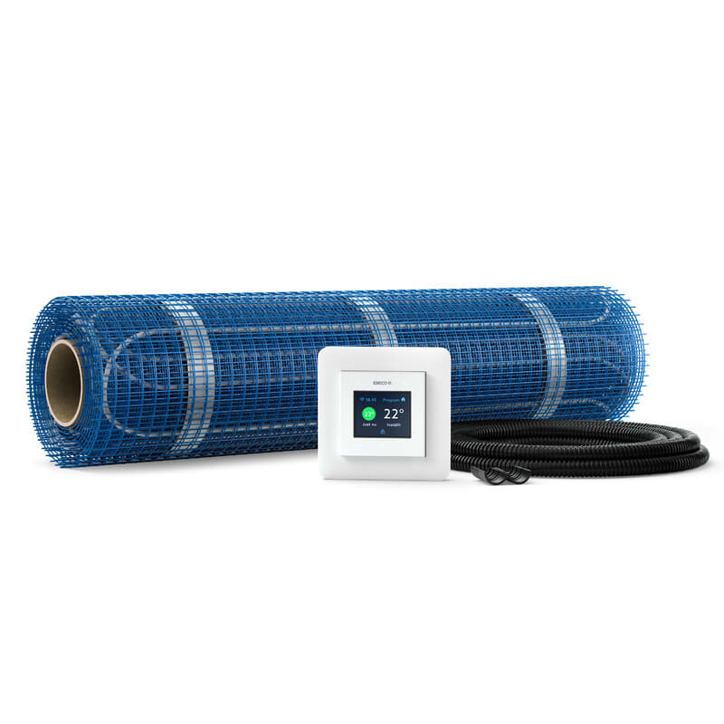 Thermoflex lattialämmitysmatto on ratkaisu, joka sopii erinomaisesti avoimille ja säännöllisille pinnoille, joissa on vähän esteitä. Kaapeli on esiasennettu tarramattoon, joka rullataan auki ja kiinnitetään samalla kertaa. Asennus onnistuu helposti ja nopeasti, sillä mattoa voi leikata tarvittavan kokoiseksi ja asettaa sen haluamallesi pinnalle. Lämpökaapeli on kiinnitetty itsekiinnittyvään, alkalinkestävään lasikuituverkkoon kiinteällä c/c-etäisyydellä, mikä takaa tasaisen ja tehokkaan lämmityksen. ThermoflexKit 500 sisältää lämpökaapelimaton, termostaatin EB-Therm 500 useilla eri energiansäästöohjelmilla sekä anturiletkun ja varoituskilven. • Pinta-ala: 5,4 m² • Teho: 120 W/m² • Lämpöjohtimen kuorma: 11 W/m • Paksuus: 4 mm • Leveys: 500 mm • Kytkentäjännite: 230 V